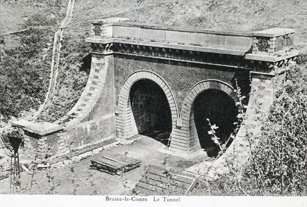 Reproductie van een postkaart met als opschrift 'Braine-le-Comte Le Tunnel'. De postkaart toont de zuidelijke ingang van de 544 meter lange tunnel. We zien twee kokers, waarvan slechts één in dienst was. De linkse koker was tijdens het bouwen in 1840-'41 immers ingestort.