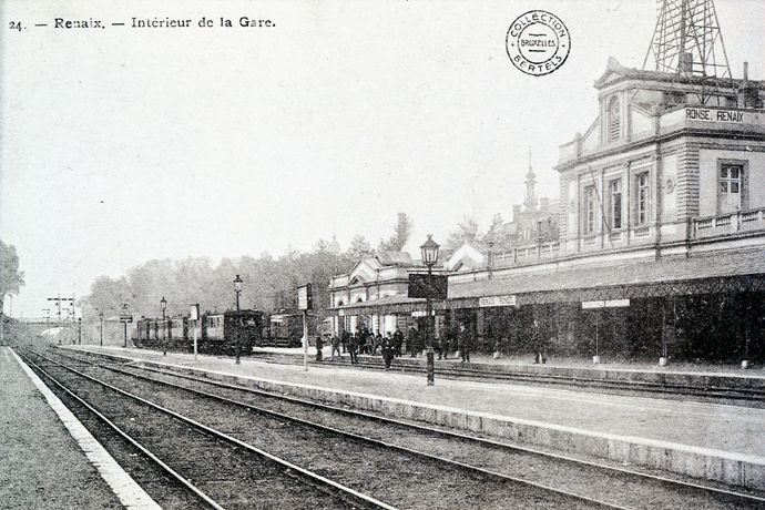 Reproductie van een postkaart met als opschrift '24. - Renaix. - Intérieur de la Gare.' De postkaart toont de achtergevel van het stationsgebouw, gefotografeerd vanop de sporen. Het stationspersoneel poseert voor de luifel en op de sporen. Aan het eerste perron staat een reizigerstrein.