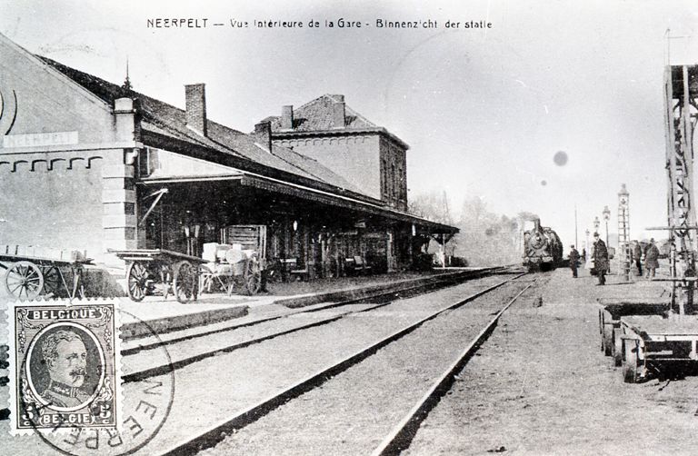 Reproductie van een postkaart met als opschrift 'Neerpelt - Vue Intérieure de la Gare - Binnenzicht der statie.' De postkaart toont de achtergevel van het stationsgebouw gefotografeerd vanop de sporen. Onder en naast de luifel over het eerste perron staan verschillende handkarren. Aan het tweede perron komt een stoomtrein aan. Onderaan links kleeft een afgestempelde postzegel.