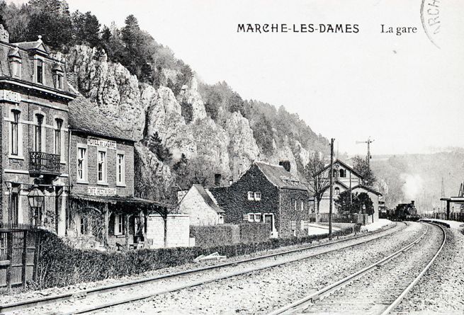 Reproductie van een postkaart met als opschrift 'Marche-les-Dames La Gare'. We zien de zijgevel van het station. Aan het tweede perron komt een stoomlocomotief aan. Op de voorgrond zien we de achtergevel van het 'Hotel de la Gare'.