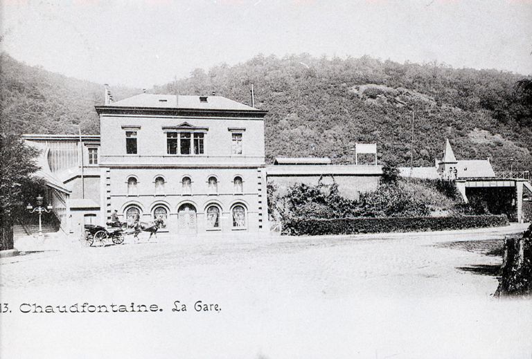 Reproductie van een postkaart met als opschrift '13. Chaudfontaine. La Gare.' De postkaart toont de voorgevel van het station. Links van het gebouw is een overdekte trap te zien die naar de perrons leidt. Voor het station rijdt een paardenkoets.