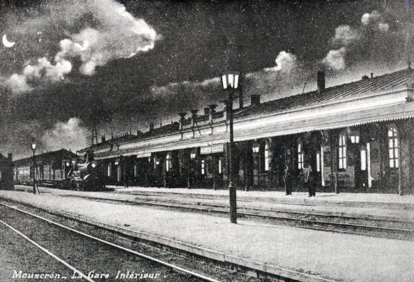 Reproductie van een postkaart met als opschrift ' Mouscron - La Gare Interieure.' De postkaart toont de perrongevel van het station, gefotografeerd bij nacht van op de sporen. Het stationspersoneel poseert op het eerste perron. Een stoomlocomotief rijdt het station binnen.