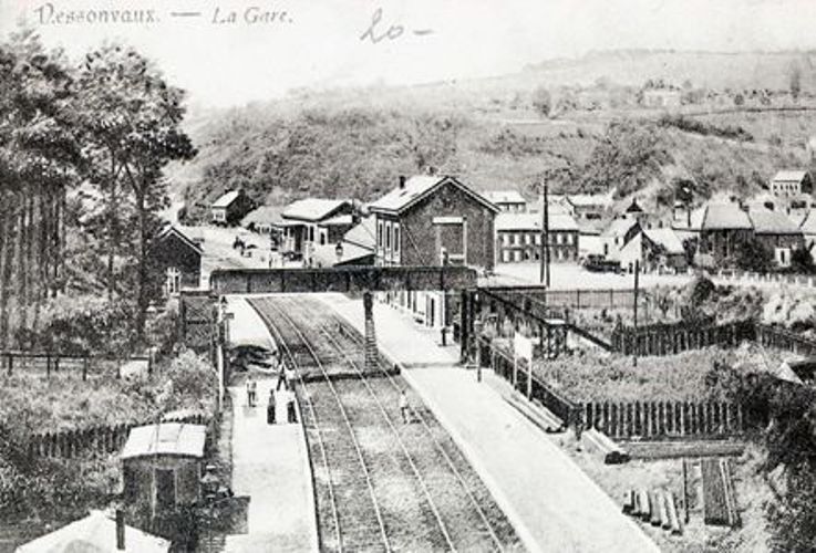 Reproductie van een postkaart met als opschrift ' Nessonvaux. - La Gare.' De postkaart toont de stationsgebouwen en de beide perrons. Over de sporen loopt een voetgangersbrug. Spoorwegpersoneel poseert op de sporen en het perron.