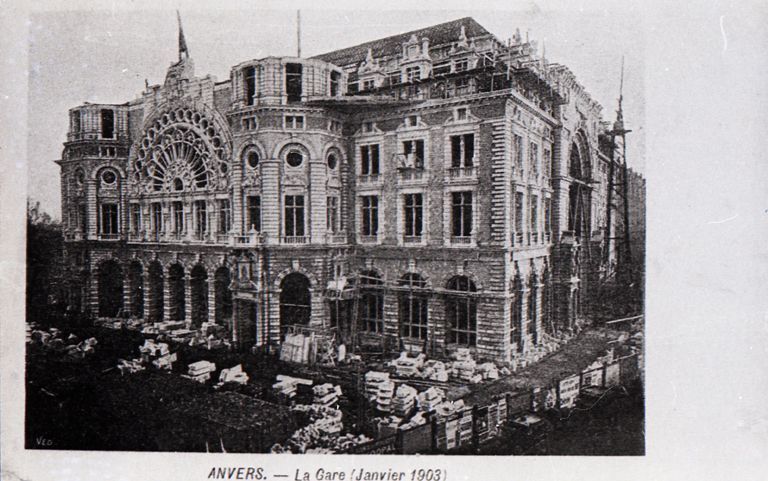 Reproductie van een postkaart met als opschrift 'Anvers. - La Gare (Janvier 1903)'. De postkaart toont de voor- en zijgevel van het stationsgebouw in aanbouw. De bovenstructuur van het dak en de torentjes zijn nog niet afgewerkt.