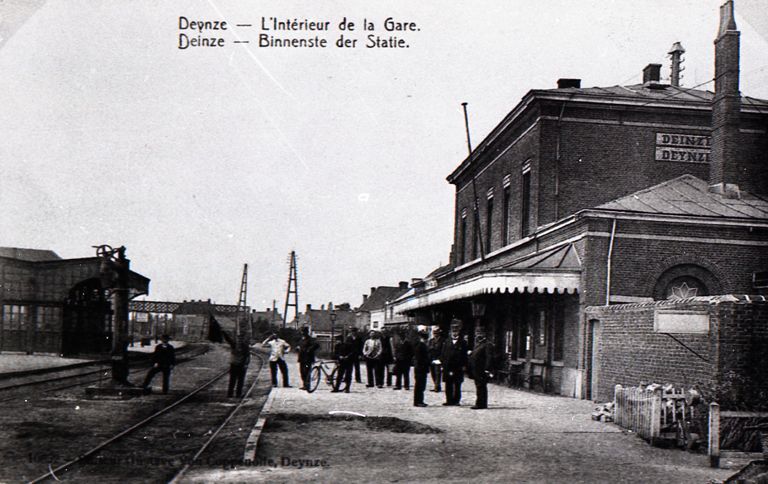 Reproductie van een postkaart met als opschrift 'Deynze - L'Intérieur de la Gare. Deinze - Binnenste der Statie. 10652 - Editeur Gustave Van Coppernolle, Deynze.' De postkaart toont de achter- en zijgevel van het stationsgebouw. Het stationspersoneel poseert op het eerste perron en de sporen. Op het tussenperron staat een schuilhuisje. Tussen de sporen zien we een waterkolom, om stoomlocomotieven van vers water te kunnen voorzien.