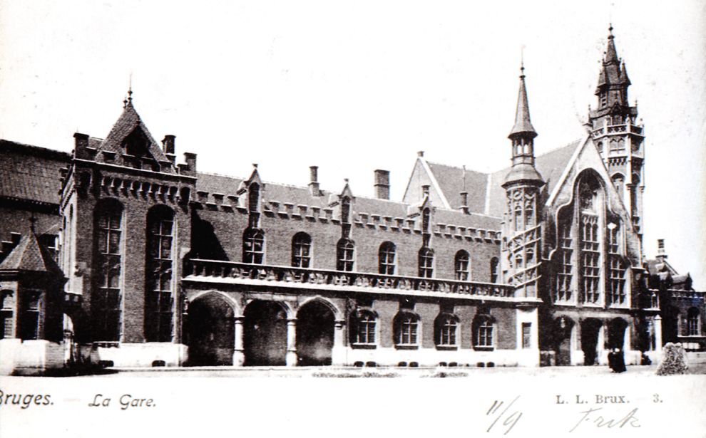 Reproductie van een postkaart met als opschrift 'Bruges. - La gare. L.L. Brux. - 3.' De postkaart toont de voorgevel van het neogotische stationsgebouw. Onderaan staat een handgeschreven boodschap.