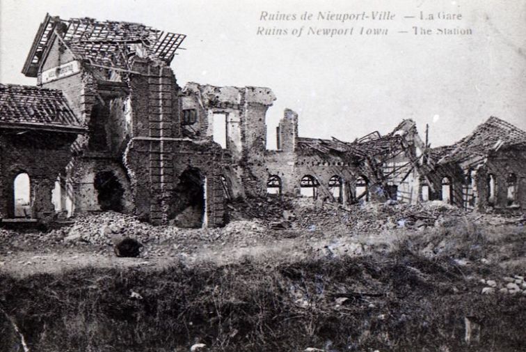 Carte postale des ruines de la gare de Nieuport-Ville
