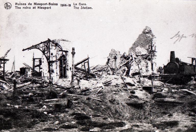 Reproductie van een postkaart met als opschrift 'Ruines de Nieuport-Bains The ruins at Nieuport 1914-18 La Gare. The Station.' We zien de ruïne van het vernielde station na de Eerste Wereldoorlog.