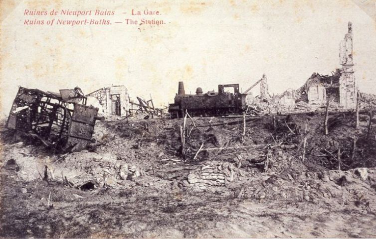 Reproductie van een postkaart met als opschrift 'Ruines de Nieuport-Bains La Gare Ruins of Newport-Baths. - The Station.' We zien de ruïne van het vernielde station Nieuwpoort-Bad en de resten van een verwoeste stoomlocomotief en goederenwagen.