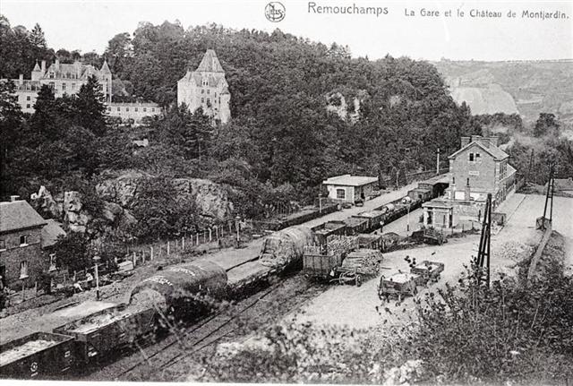 Reproductie van een postkaart met als opschrift 'Remouchamps La Gare et le Château de Montjardin.' Rechts zien we het station. Er staat een goederentrein aan het perron. Links op de heuvel is het kasteel te zien.