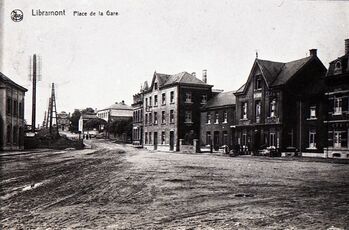 BeschrijvingReproductie van een postkaart met als opschrift 'Libramont Place de la Gare.' De postkaart toont de gebouwen aan het stationsplein. Uiterst links zien we nog een deel van het stationsgebouw.