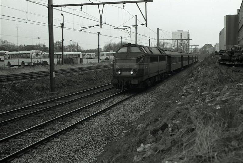 TitelDiesellocomotief 5174 met K-rijtuigen te Anderlecht-West