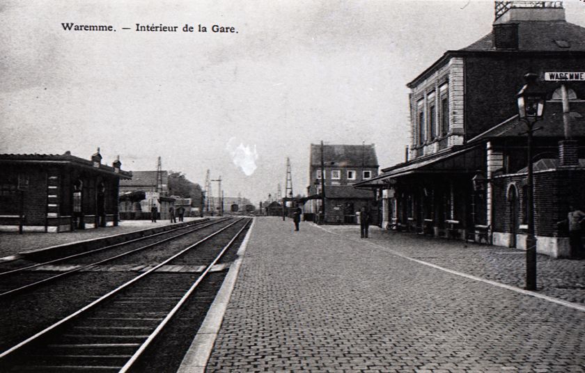 Reproductie van een postkaart met als opschrift 'Waremme. - Interieur de la Gare.' De postkaart toont de achter- en zijgevel van het stationsgebouw, de perrons en twee sporen. Op de perrons poseert spoorwegpersoneel.