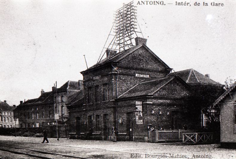 Reproductie van een postkaart met als opschrift 'Antoing. - Intér. de la Gare Edit. Bourgies Mathieu, Antoing.' Deze postkaart toont de zij- en achtergevel van het station, gefotografeerd vanop de sporen. Op het dak staan een aantal telegraafmasten.