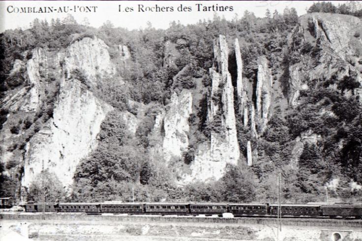 BeschrijvingReproductie van een postkaart met als opschrift 'Comblain-au-Pont Les Rochers des Tartines'. De postkaart toon een reizigerstrein met verschillende rijtuigen voor de rotsen te Comblain-au-Pont.