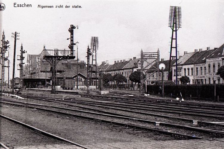 Reproductie van een postkaart met als opschrift 'Esschen Algemeen zicht der statie.' Op de postkaart zien we de zijgevel van het station, gefotografeerd vanop de sporen. Aan de sporen staan verschillende mechanische seinen.