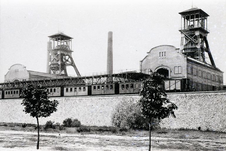BeschrijvingReproductie van een postkaart zonder opschrift. Op de postkaart zien we een arbeidstrein die de kompels tot aan de mijngebouwen en schachtbokken bracht.