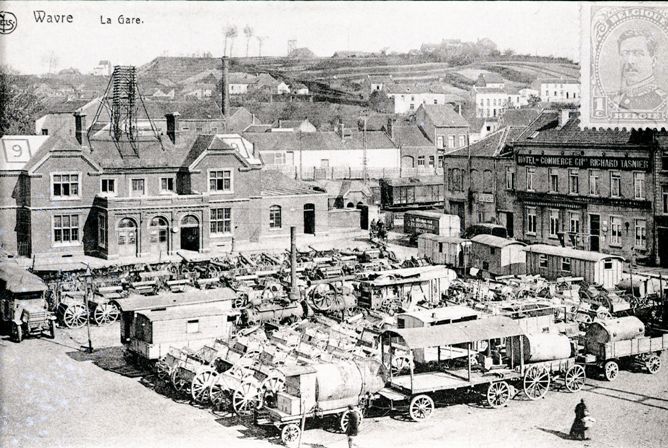 Reproductie van een postkaart met als opschrift 'Wavre La Gare.' Op de postkaart zien we de voorgevel van het station. Op het stationsplein staat een verzameling van gesloten wagens, paardenkoetsen, vrachtwagens en stoomvoertuigen. Rechtsboven kleeft een postzegel.