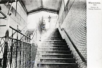BeschrijvingReproductie van een postkaart met als opschrift 'Waremme. 7924 Escalier du Passage Souterrein.' Op de postkaart zien we een trap naar de ondergrondse spoordoorgang.