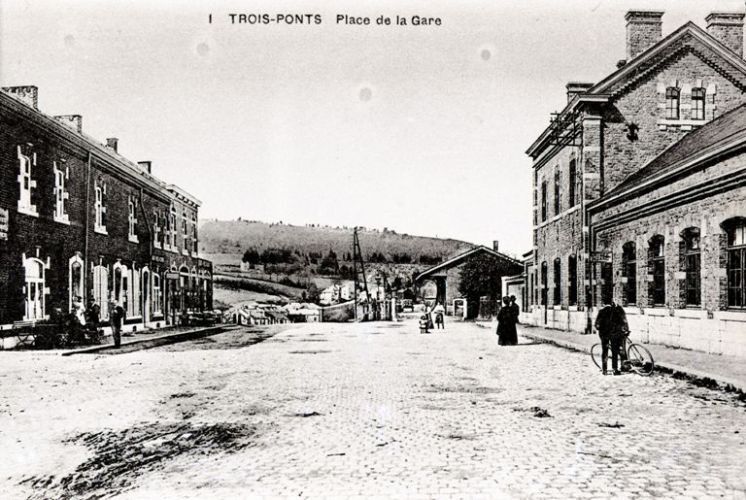 BeschrijvingReproductie van een postkaart met als opschrift '1 Trois-Ponts Place de la Gare'. Op de postkaart zien we de voorgevel van het station en het stationsplein met een rij huizen.