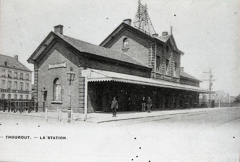 BeschrijvingReproductie van een postkaart met als opschrift '- Thourout. - La Station.' We zien de zij- en achtergevel van het station, gefotografeerd vanop de sporen. Stationspersoneel poseert onder de luifel.
