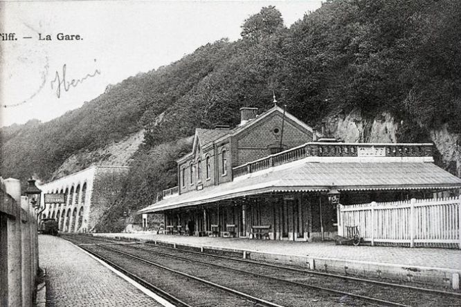 Reproductie van een postkaart met als opschrift 'Tilff. - La gare.' We zien de zij- en achtergevel van het station, gefotografeerd vanop het tweede perron. Bovenaan links werd met de hand de naam 'Henri' geschreven.
