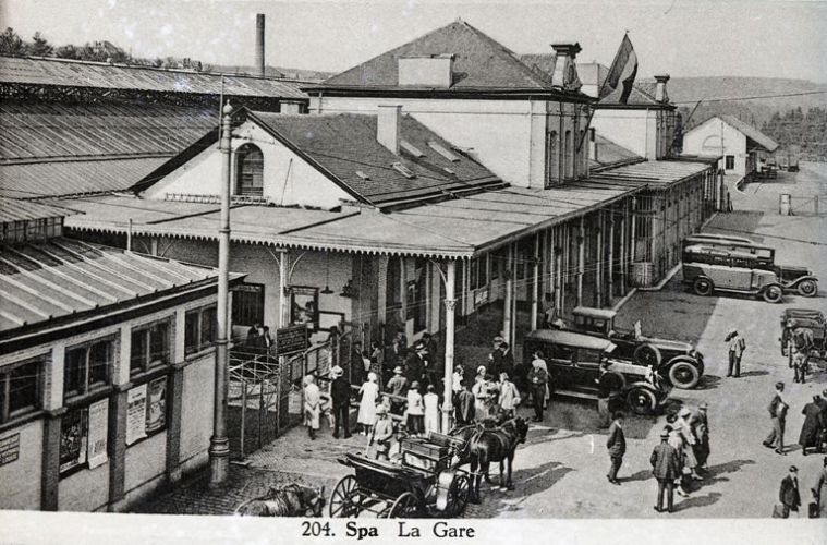 Reproductie van een postkaart met als opschrift '204. Spa La Gare'. We zien de zij- en voorgevel van het station en een deel van het dak van de spoorhal. Voor het station staan auto's en een koets. Verschillende personen staan te wachten op aankomende reizigers. Op de foto zien we hoe de kaartjesafnemer de toegang tot het perron bewaakt.