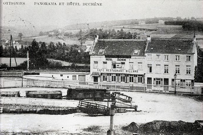 Reproductie van een postkaart met als opschrift 'Ottignies Panorama et Hôtel Duchène'. De postkaart toont een zicht op de stationsomgeving en het 'Hotel Duchène'. Op de voorgrond staan op het stationsplein een kar en enkele open platte wagens.