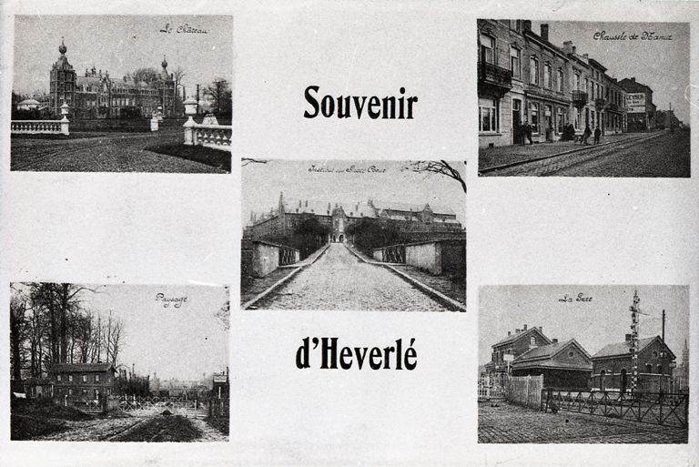 Reproductie van een postkaart met als opschrift 'Souvenir d'Heverlé Le Château Chausée de Namur Institut du Sacré Coeur Paysage La Gare'. Deze postkaart bestaat uit een combinatie van 5 foto's. Eén foto toont de zijgevel van het station, gefotografeerd vanaf de gesloten overweg. Een andere foto toont een gesloten overweg op het grondgebied Heverlee. De drie andere foto's tonen enkele huizen en het kasteel.