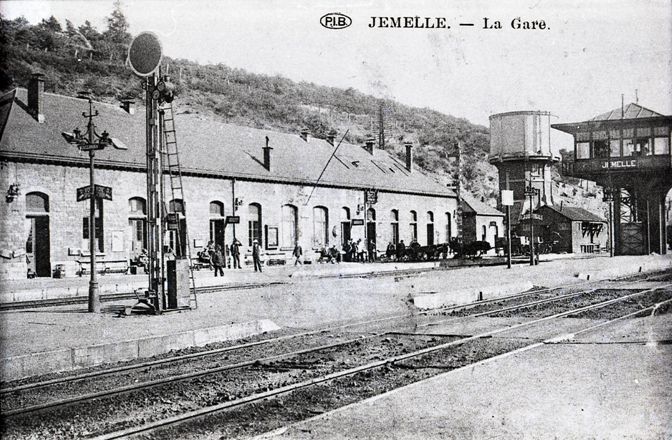 Reproductie van een postkaart met als opschrift ' Jemelle. - La Gare.' De postkaart toont de achtergevel van het stationsgebouw met rechts ervan een watertoren. Op het tussenperron staat een seinpaal en een seinhuis. Verschillende personen poseren voor de achtergevel.