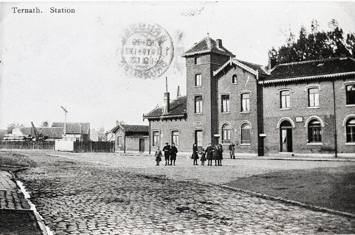 BeschrijvingReproductie van een postkaart met als opschrift 'Ternath. Station'. De postkaart toont de voorgevel van het station. Kinderen poseren op het stationsplein. Op de postkaart staat een onleesbare stempel.