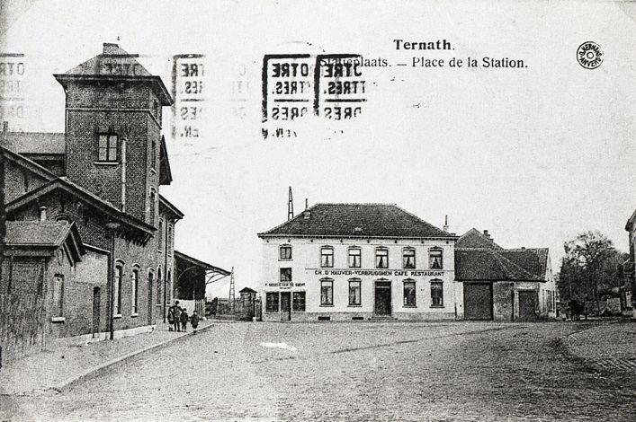 Reproductie van een postkaart met als opschrift 'Ternath. Statieplaats. - Place de la Station.' De postkaart toont de zij- en voorgevel van het station met enkele kinderen ervoor. Er is ook een café op het stationsplein te zien. Op de kaart staat een onleesbare stempel