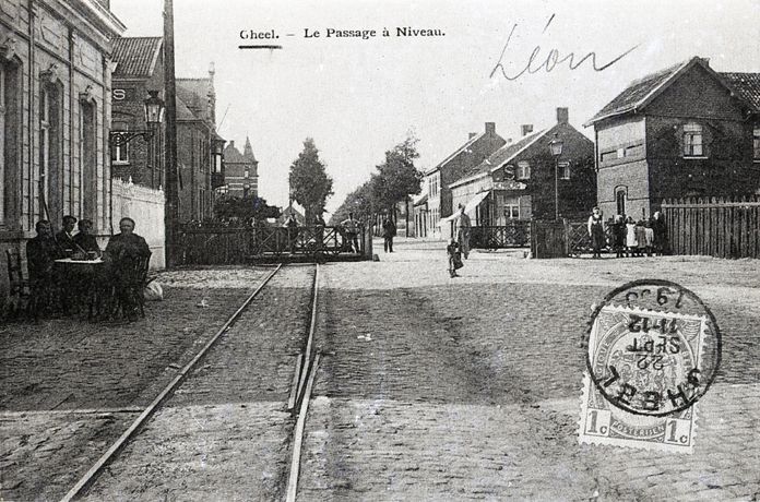 Reproductie van een postkaart met als opschrift 'Gheel. Le passage à Niveau.' De postkaart toont een spoor dat naar een overweg loopt. Voor de aanpalende huizen en de overweg poseren enkele personen. Op de kaart staat de naam 'Léon' geschreven en kleeft een afgestempelde postzegel.