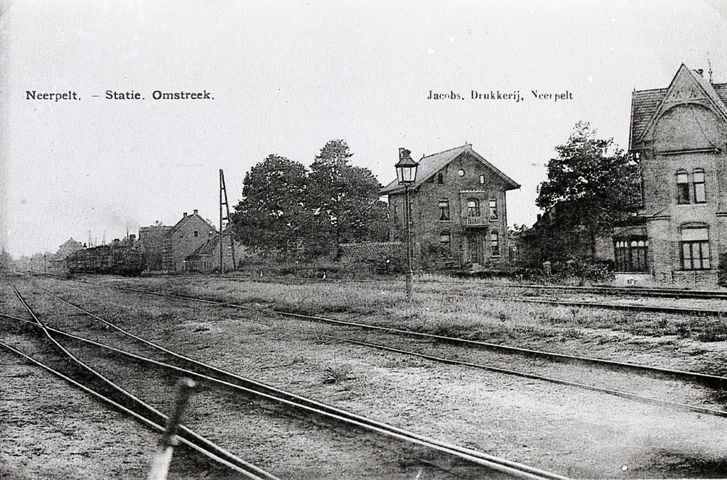 Reproductie van een postkaart met als opschrift 'Neerpelt - Statie. Omstreek. Jacobs. Drukkerij. Neerpelt'. De postkaart toont de sporen en huizen in de omgeving van het station. Een stoomlocomotief komt aangereden.