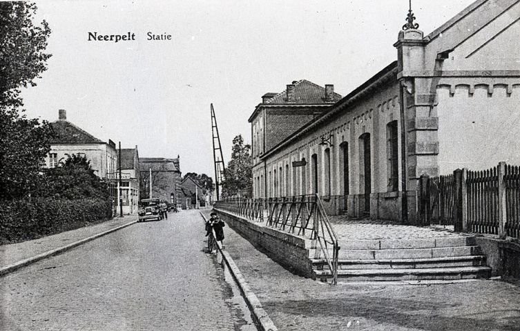 BeschrijvingReproductie van een postkaart met als opschrift 'Neerpelt Statie'. De postkaart toont de voorgevel en de straat voor het station.