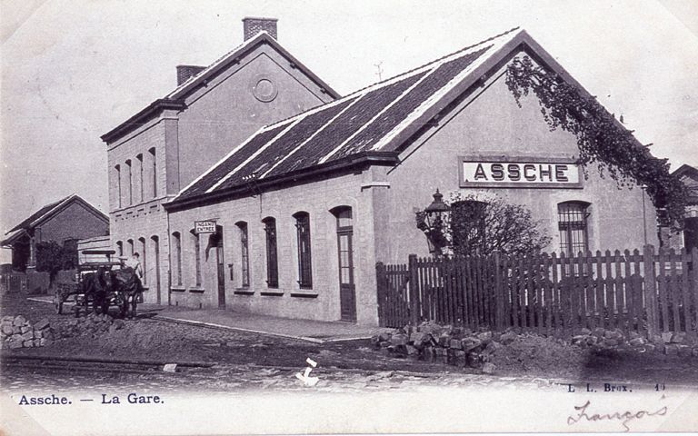 BeschrijvingReproductie van een postkaart met als opschrift 'Assche. - La Gare. L L. Brux.' We zien de zij- en voorgevel van het station. Voor het station staat een paardenkoets. Onderaan werd met de hand 'François' geschreven.