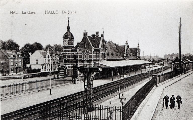 Reproductie van een postkaart met als opschrift 'Hal La Gare. Halle De Statie'. De postkaart toont de zij- en achtergevel van het station, gefotografeerd vanover het spoor. De luifel over het eerste perron en een sein op het uiteinde van het tweede perron zijn duidelijk zichtbaar.