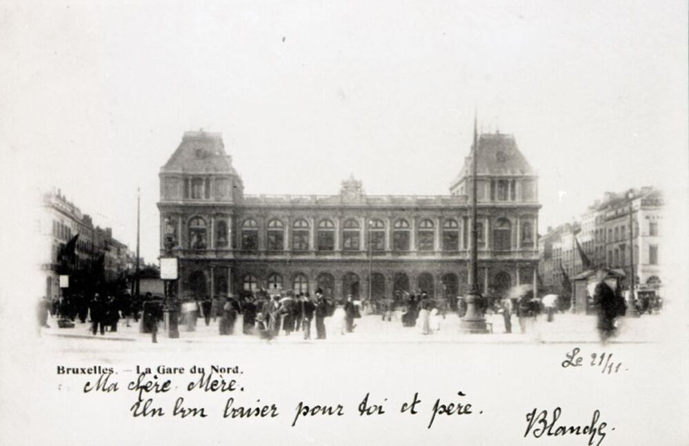 Reproductie van een postkaart met als opschrift 'Bruxelles. - La Gare du Nord.' De postkaart toont de voorgevel van het station. Verschillende voorbijgangers lopen op het stationsplein. Onderaan de kaart staat een handgeschreven boodschap.