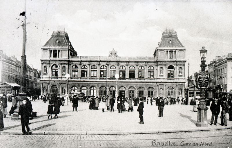 Reproductie van een postkaart met als opschrift 'Bruxelles. Gare du Nord.' De postkaart toont de voorgevel van het station. Verschillende voorbijgangers lopen op het stationsplein.