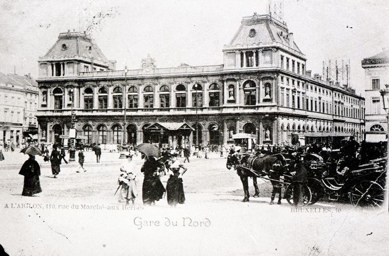 Reproductie van een postkaart met als opschrift 'Gare du Nord Bruxelles, 1e A L'Aiglon, 110 rue du Marché-aux-Herbes'. De postkaart toont de voorgevel van het station en het stationsplein met voorbijgangers. Op de voorgrond staan verschillende paardenkoetsen.