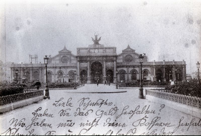 DescriptionReproduction d'une carte postale sans inscription. On y voit la monumentale façade avant de la gare. Dans le bas de la carte, il y a un message manuscrit.