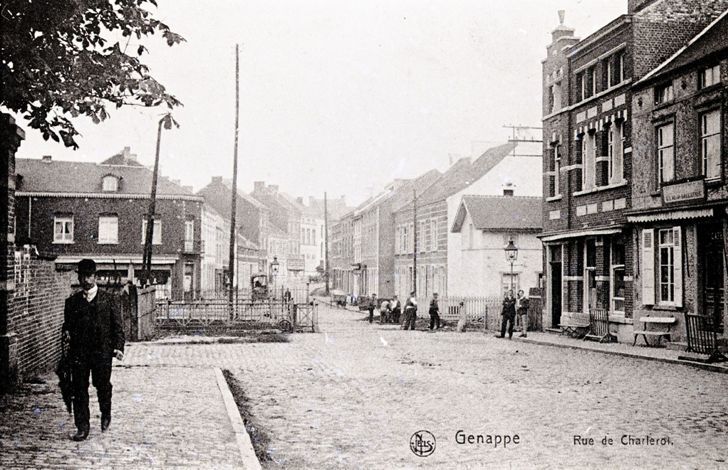 BeschrijvingReproductie van een postkaart met als opschrift 'Genappe Rue de Charleroi.' De postkaart toont een straat, met haar bewoners, die naar een overweg leidt. De rolbarelen van de overweg zijn geopend.