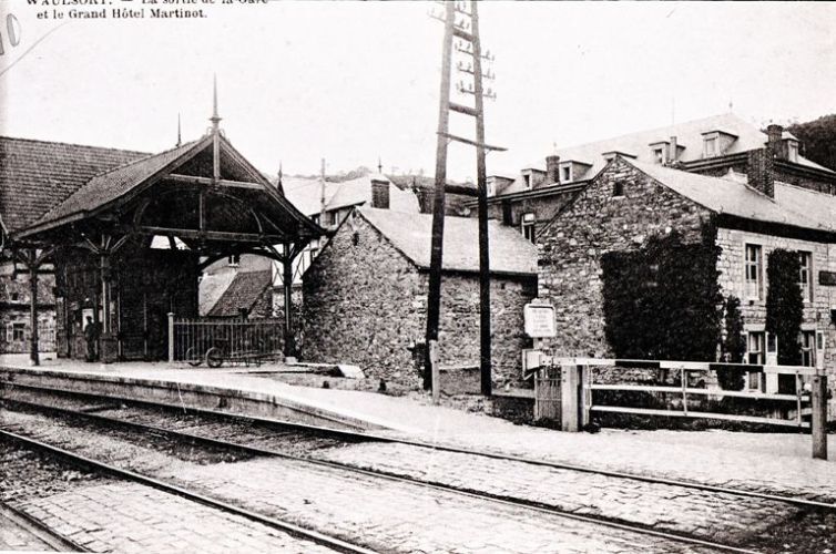BeschrijvingReproductie van een postkaart met als opschrift 'Waulsort. La sortie de la Gare et le Grand Hôtel Martinot.' De postkaart toont een gesloten overweg en het einde van het perron met een wachthuisje.