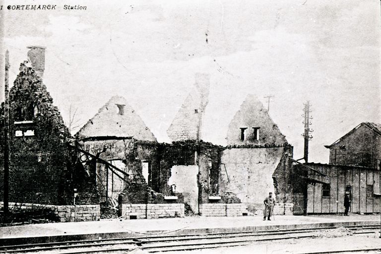 Reproduction d'une carte postale portant l'inscription «1 Cortemarck Station». Photographiés depuis les voies, On aperçoit les ruines de la gare après la Première Guerre mondiale. Il y a deux hommes sur le quai.
