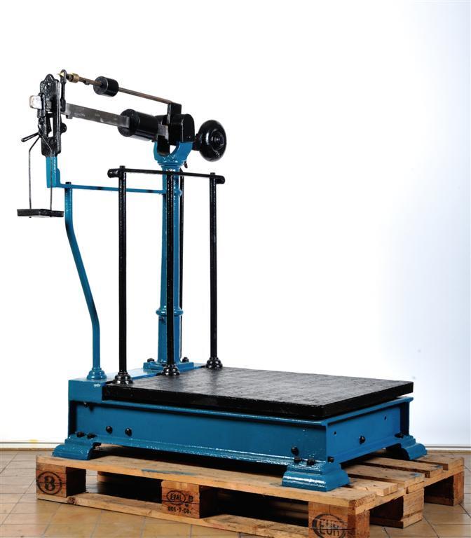 BeschrijvingBlauw-zwarte weegschaal met een groot benedenoppervlak om de bagage te plaatsen. Bovenaan een stang met inscripties van gewichten (tot 500 kg), waarover het gewicht geschoven werd om een juiste meting te verkrijgen.