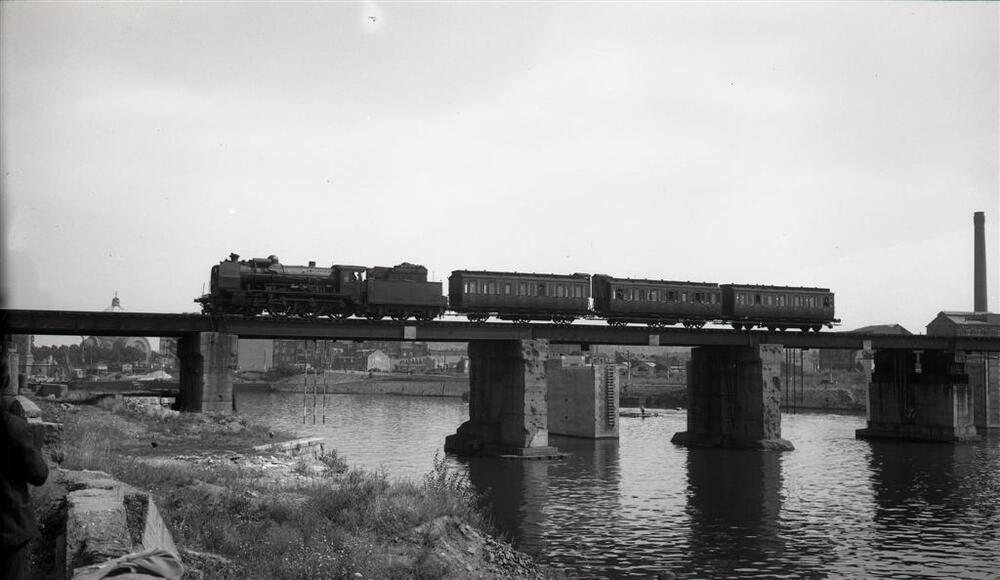 BeschrijvingDe foto toont de linkerzijde van de locomotief van het type 9 (2C Ten Wheel). Zij trekt drie ex-Duitse rijtuigen over de brug van Val-Benoît.