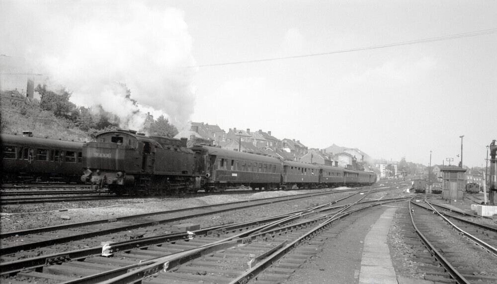 Op de foto zien we de rechterzijde van de tenderlocomotief, die behoort tot het type 99 (Et). De locomotief duwt een trein over de bundel bij het station Luik-Guillemins. Op de voorgrond zien we een wissel en rechts een seinpost.