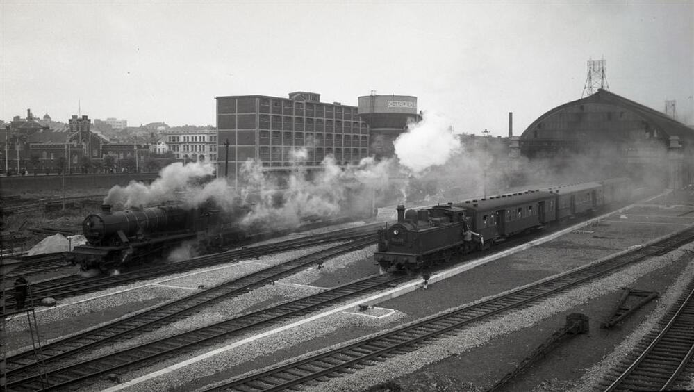 Deze foto toont een stoomlocomotief die behoort tot het type 31 (1D Consolidation) en rechts daarvan een tenderlocomotief van het type 53 (Dt). Deze laatste trekt drie M 1-rijtuigen. Op de achtergrond zien we een watertoren en rechts daarvan de overdekte sporenhal van het station Charleroi-Zuid.
