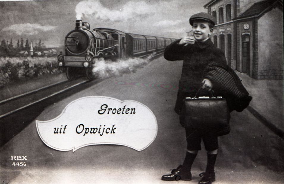 Reproductie van een postkaart met als opschrift 'Groeten uit Opwijck REX 4456'. De postkaart toont een jongen in reizigersuitrusting die poseert voor een geschilderde achtergrond met daarop de achtergevel van een station en een binnenrijdende stoomtrein.