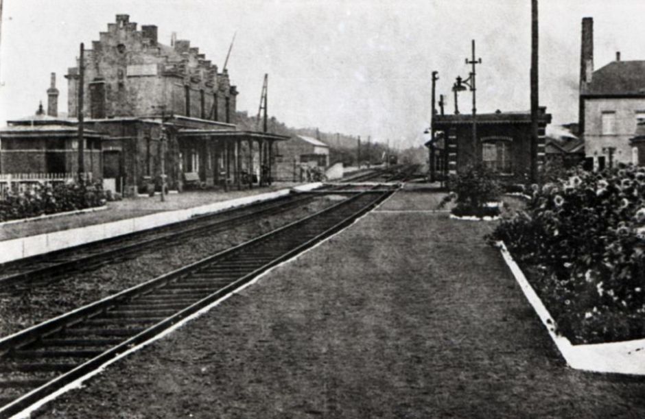 BeschrijvingReproductie van een postkaart zonder opschrift. De postkaart toont de zij- en achtergevel van het station. We zien ook het wachthuisje op het tweede perron.